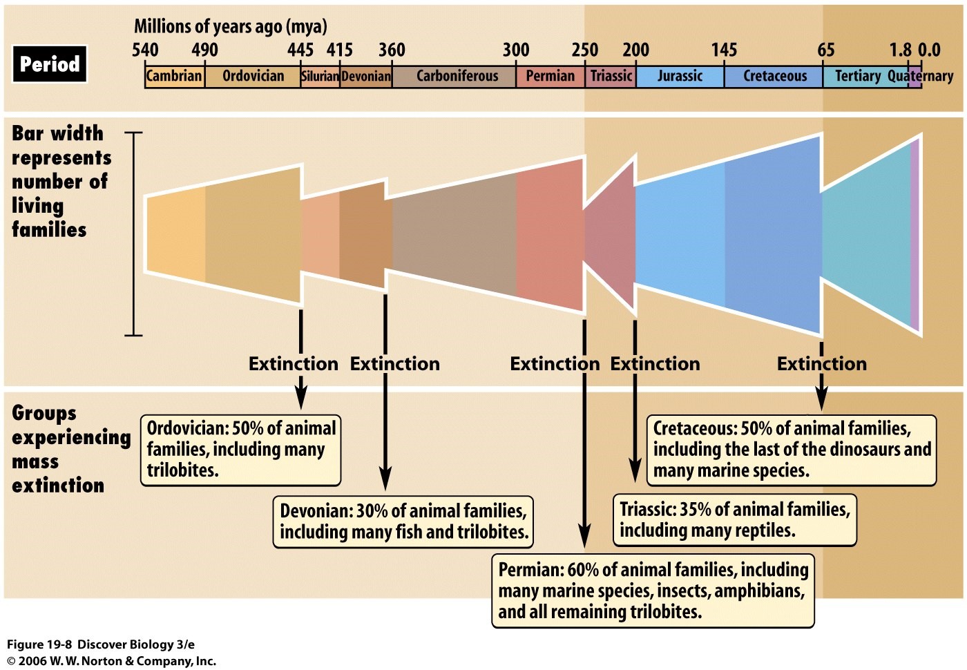 Originations of new groups and rapid diversification (or “radiation”) of certain groups, like Bilateria in the Cambrian, characteristically follow mass extinctions [--]. These rapidly radiating groups may have arisen in the previous geological period, as we now know was the case for Bilateria [--]. There is general agreement that depopulation of existing ecological niches and the creation of new ecological niches by the novel organisms themselves are critical but hard to quantify factors in the dynamics of the appearance of new organisms in the record. Over time, of course, originations have to outnumber extinctions for life to sustain and increase its necessary diversity. There is a long-term increase in the number of taxonomic families visible in the fossil record that extends over multiple mass extinction-origination episodes [--].” [Shapiro (pp. 408-409).]