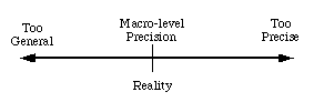 Let me say this again. I am arguing that the basic lexical stock of our languages is FULLY USEFUL at the macro-level of everyday ambiguity. They are PERFECTLY acceptable--because, among other reasons, there are NO OTHER LEVELS of 'less ambiguity' that still describe the 'real world'. The apparent precision of technical lexicons and descriptions and calculi and formulations is generally just that--APPARENT. What this leads me to is the simple notion that ordinary ambiguity is AS CLOSE AS WE GET TO "REALITY"--indeed, it IS reality. The more generality (after some point) we have in our terms (i.e. higher levels of ambiguity) the less 'attached to reality' our terms are. And the more precise (after some point) our terms are, the less 'attached to reality' our terms are as well (see the spectrum diagram below).